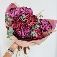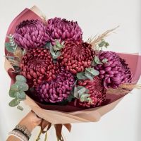 Стильный и выразительный букет из бигуди-хризантем в тёплых коричневых и насыщенных винных оттенках. Он добавляет уют и элегантность любому интерьеру или становится эффектным подарком. Для кого: для девушки, жены, мамы, подруги или для оформления дома. Повод: день рождения, юбилей, романтический сюрприз, осенний подарок или знак внимания без повода. Особенности: крупные декоративные бутоны, глубокие оттенки, стильная форма и долгий срок стояния. Доставка: аккуратная упаковка и своевременная доставка, чтобы букет дошёл свежим и красивым.