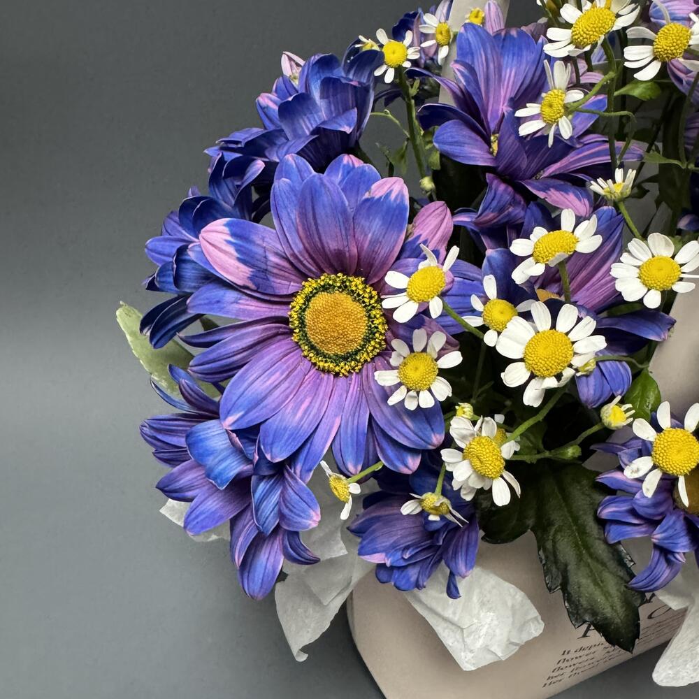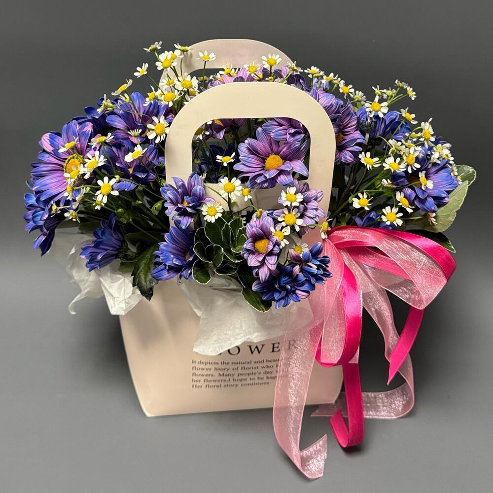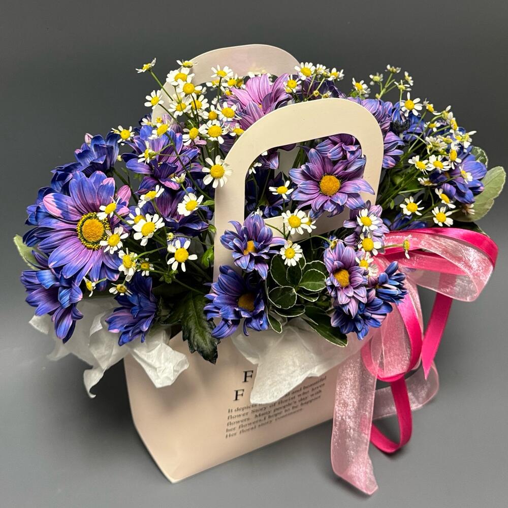 Оригинальная сумочка в космических цветовых оттенках с элементами нежности и воздушности ромашек порадует и оставит только приятные впечатления! Создайте настроение и получите эмоции от сделанного подарка) Чтобы продлить жизнь цветам в коробке, обеспечьте им прохладное место без сквозняков и прямых солнечных лучей, ежедневно подпитывайте флористическую губку водой (избегая попадания на бутоны), удаляйте увядшие листья и цветы, а также держите композицию подальше от фруктов и источников тепла. С любовью и заботой, доставка цветов в Саратове и Энгельсе, Прованс64