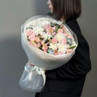 Хризантема кустовая - 2 шт. Эвкалипт - 3 шт. Лента атласная - 1 шт. Пленка матовая - 1 шт. Бомбастик роза - 3 шт. альстромерия розовая - 3 шт.
