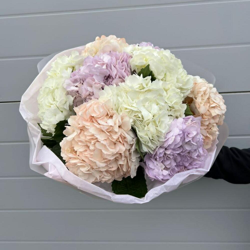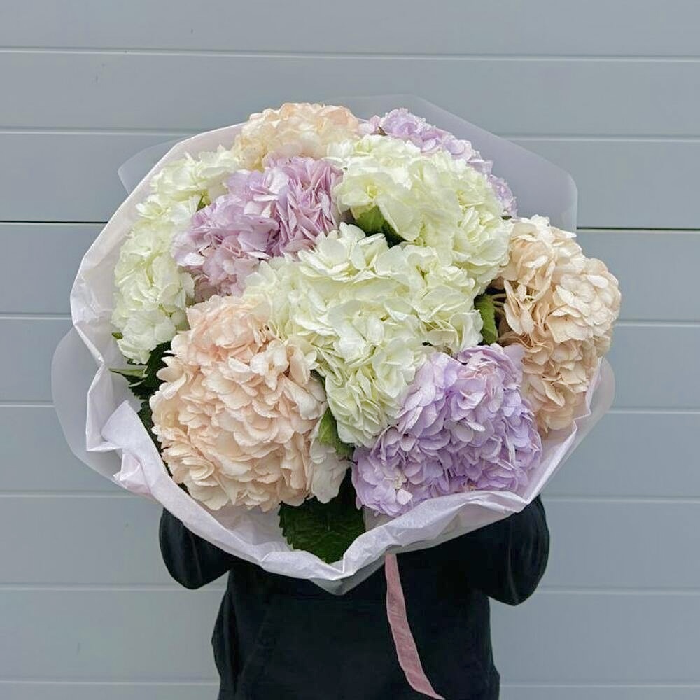 Гортензия — символ нежности, искренности и элегантности. В таком объёме цветы смотрятся особенно эффектно: каждая шапка крупная и пышная, а вместе они образуют премиальный букет внушительных размеров.