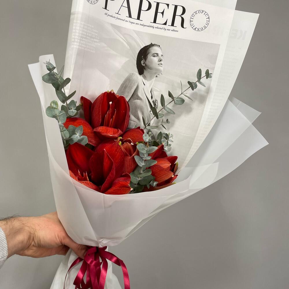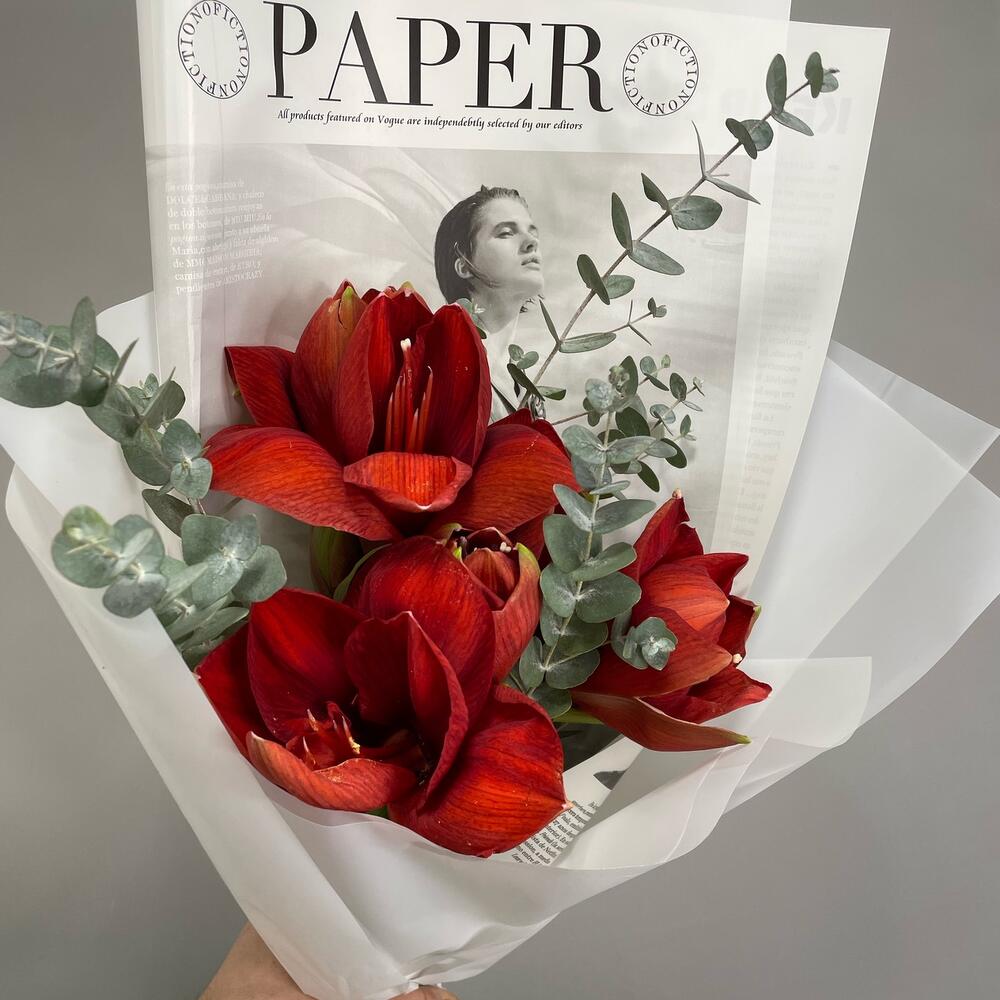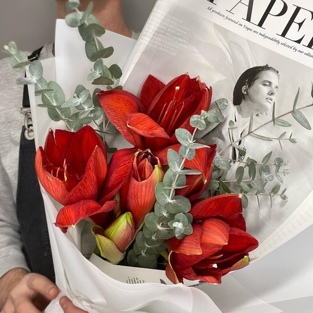 Букет из трёх красных амариллисов с эвкалиптом — это роскошная композиция, которая притягивает внимание насыщенным цветом и элегантной формой. Амариллис считается символом силы, уверенности и благородства, поэтому такой букет всегда выглядит статусно и торжественно.