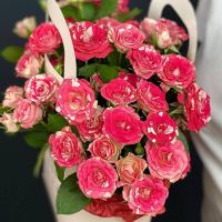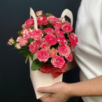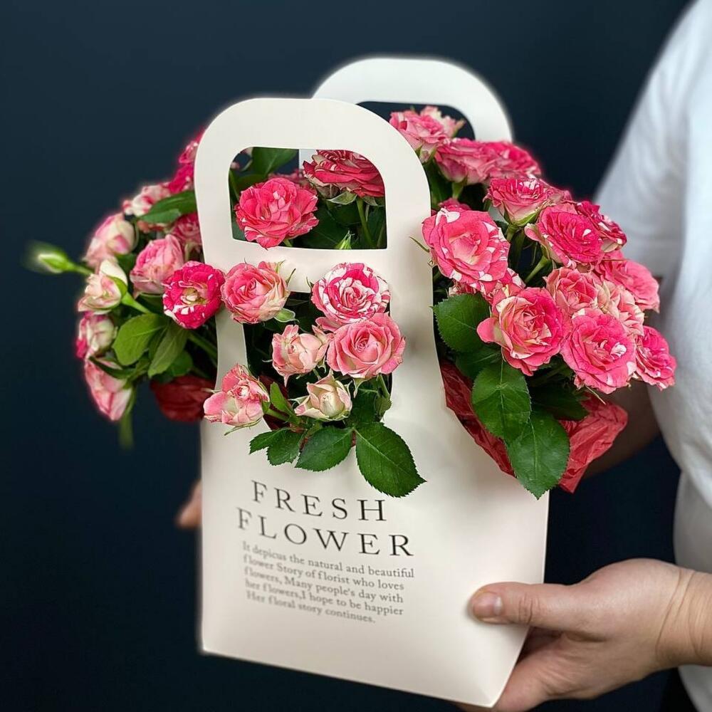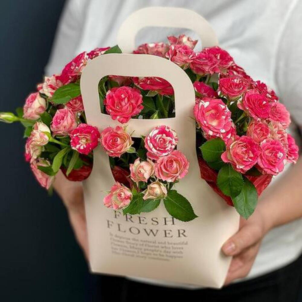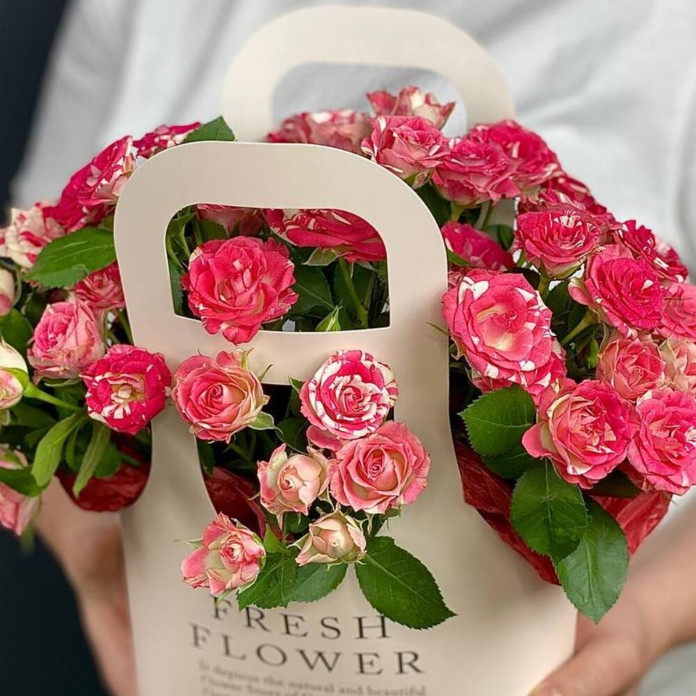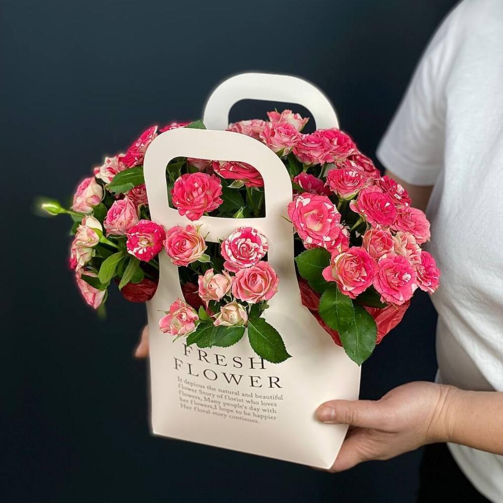 Эффектная композиция из ярких кустовых роз в декоративной сумочке. Идеальный подарок — стильный, яркий и запоминающийся.